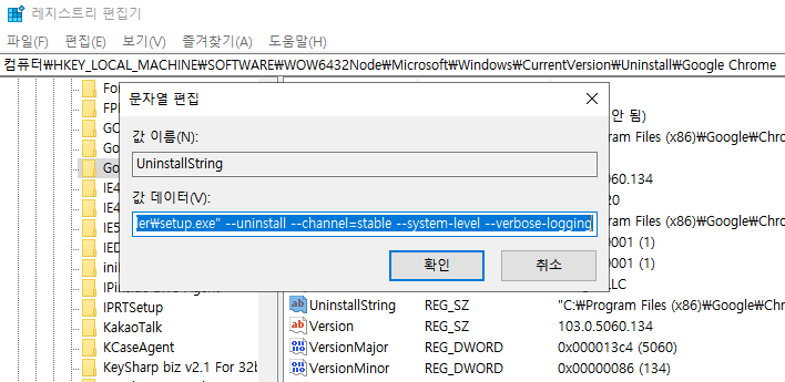 이 예시의 경우 크롬 삭제 커맨드는 아래와 같이 확인되므로, cmd 창에서 아래 커맨드를 직접 실행하면 제어판에서 제거한 것과 동일하게 삭제 진행됩니다.
