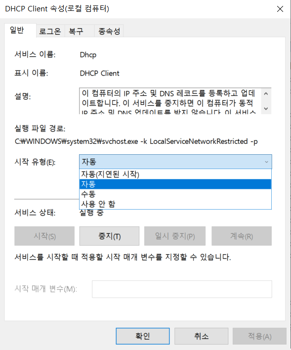 services.msc 명령어로 서비스 창을 열고, DHCP Client 서비스가 실행중인지 확인합니다.
