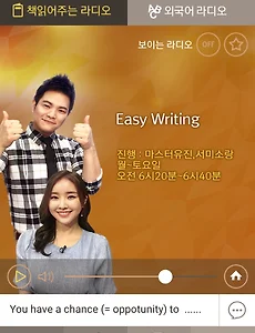 728x90 EBS1 [영작 추천] EBS 라디오-Easy Writing (feat. 마스터유진,서미소랑) (매일 아침 5문장 영작하면서 잠깨기) [영작 추천] EBS 라디오- Easy Writing 영작(마스터유진, 서미소랑)월~토 오전 6:20~6:40(20분간) * 본 내용은 본인이 직접 시도해보고 쓰는 후기입니다. 본인은 EBS 및 강사들과 무관합니다. 영어 공부 방법 한가지를 추천합니다.'영작' 입니다. TOEIC 과 같은 점수를 따기 위한 시험들은 대체로 객관식으로 진행되기 때문에, 언제부턴가 영어 문장을 직접 작성할 일이 거의 없어졌습니다. 하지만 실질적인 영어실력 상승을 위해선 영작을 빼놓을순 없겠지요.개인적으로도 손으로 글씨 쓰는걸 귀찮아 하다보니 '영작' 이라는것 자체를 지겨운 공부방법 이라고 어렴풋이 생각하고 있었습니다. 마스터 유진 영어강사의 청취 강의를 듣다가 'Easy Writing' 이란 EBS 라디오 강의교재를 어쩌다가.. 2018. 6. 20. 이전 1 다음 728x90